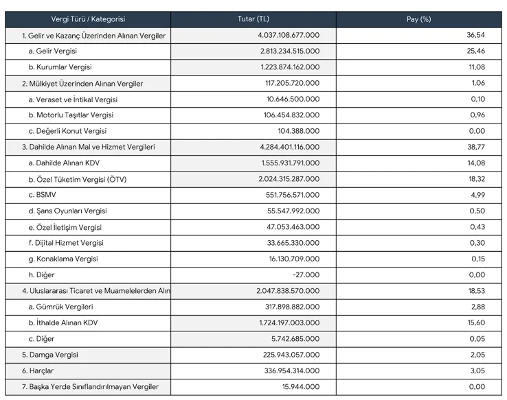 2025 yılında vergi türleri itibariyle tahsilat tutarları ve toplam vergi gelirlerine oranları tablodaki gibidir.