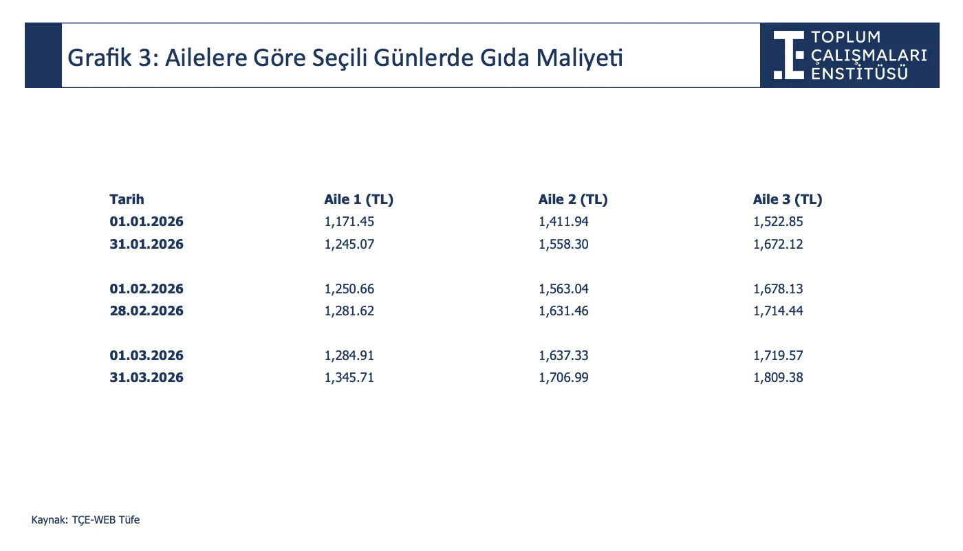 Ocak ayında bile bebekli bir ailenin (Aile 1) günlük maliyeti bin 245 lirayken, Mart sonunda bu rakamın çok daha yüksek seviyelere ulaştığı ifade edildi.