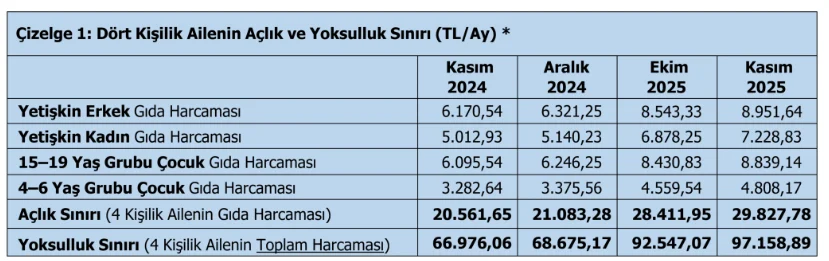 Gıda harcamasıyla birlikte giyim, konut (kira, elektrik, su, yakıt), ulaşım, eğitim, sağlık ve benzeri diğer temel ihtiyaçlar için yapılması gereken toplam harcama tutarı yani yoksulluk sınırı ise 97.159 lira oldu.