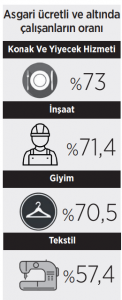 Buna göre asgari ücret ve altı çalışanların oranı yüzde 73 ile en yüksek konak ve yiyecek hizmeti olurken onu yüzde 71,4 ile inşaat sektörü, yüzde 70,5 ile giyim sektörü takip etti.