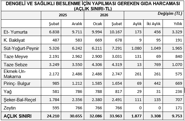 Birleşik Kamu-İş Konfederasyonunun Ar-Ge birimi KAMU-AR’ın 4 kişilik bir ailenin, dengeli ve sağlıklı beslenebilmesi için gereken gıda harcamasının yanı sıra diğer ihtiyaçlarını da yoksunluk hissi çekmeden karşılayabilmesi için olarak yapması gereken aylık harcamayı dikkate alarak hesapladığı açlık-yoksulluk sınırı araştırmasının Şubat 2026 sonuçları açıklandı.