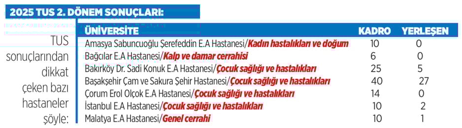 2025 TUS 2. dönem sonuçlarında ise kadroların doluluğu şöyle: