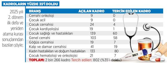 Hem Tıpta Uzmanlık Sınavı (TUS) hem de Sağlık Bakanlığı atama kurası sonuçları da bunu doğrular nitelikte. Hem TUS sonuçlarında hem de atama sonuçlarında özellikle cerrahi, jinekolojik cerrahi, çocuk onkoloji, cerrahi onkoloji, çocuk enfeksiyon hastalıkları, çocuk acil gibi pek çok branşın boş kaldığı görüldü.