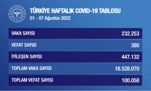 Sağlık Bakanlığı’nca açıklanan haftalık Covid-19 tablosuna göre, 1-7 Ağustos tarihleri arasında vaka sayısı 232.253 olurken, 380 kişi hayatını kaybetti.