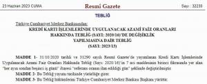 “Kredi Kartı İşlemlerinde Uygulanacak Azami Faiz Oranları Hakkında Tebliğ’de Değişiklik Yapılmasına Dair Tebliğ” ile Kredi Kartı İşlemlerinde Uygulanacak Azami Faiz Oranları Hakkında Tebliğ’in 7 nci maddesinin birinci fıkrasında yer alan “her ayın sondan beşinci iş günü” ibaresi “referans oranın ilan edildiği gün” şeklinde değiştirildi.